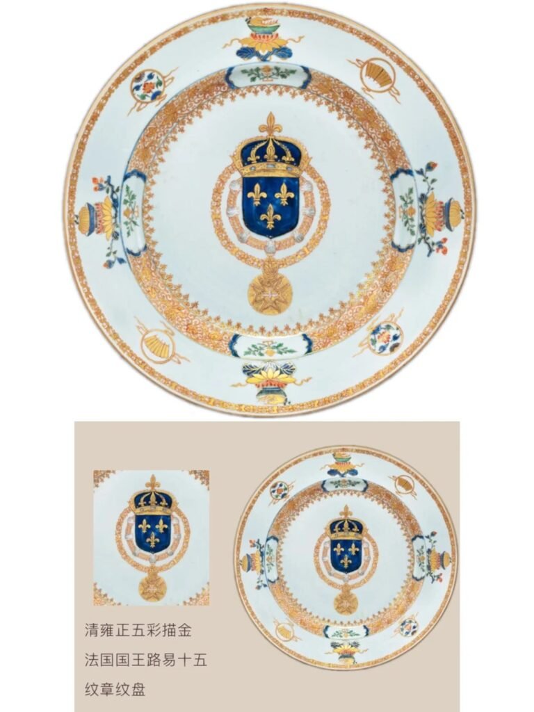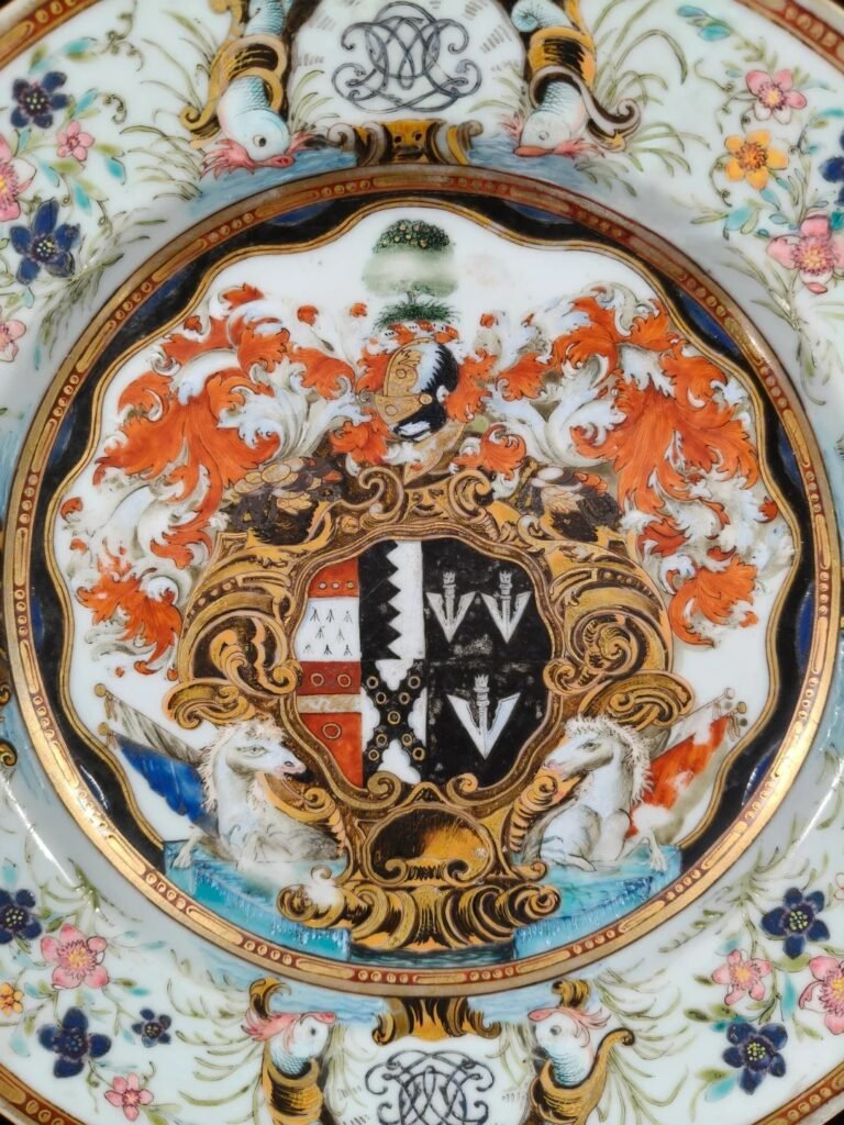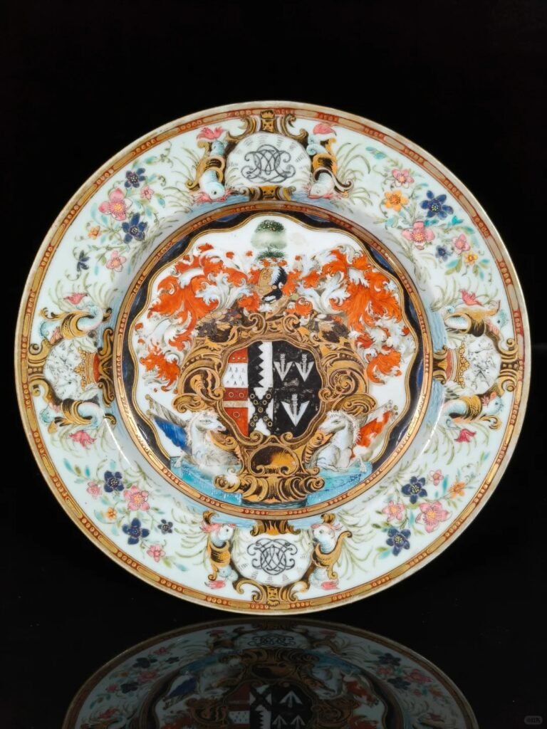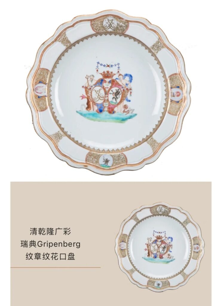 清代的“廣彩”瓷器,特別是在乾隆時期,成為了中國對外文化交流中的重要載體之一。廣彩瓷器以其豐富的色彩、精緻的繪畫風格和獨特的紋章設計著稱,尤其是歐洲王室定制瓷器中的應用,充分體現了東方審美與西方貴族需求的結合。紋章瓷是專為歐洲貴族和皇室定制的,常見的設計包含了家族徽章、王室象徵等元素,代表了中西文化的碰撞與融合。