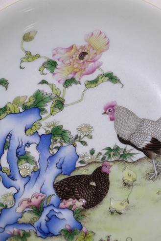 盤心以粉彩繪就大吉圖,是清代宮廷「圖必有意,意必吉祥」的典型範本:畫面中雄雞昂首挺立,羽色黑白分明,尾羽如墨漆亮;雌雞攜三隻雛雞覓食於湖石旁,旁襯牡丹、雛菊、翠竹與玲瓏湖石,構圖疏密有致,生機盎然。「雞」諧音「吉」,雄雞啼鳴寓意「雞鳴報曉、大吉大利」,攜雛圖景暗含「子孫滿堂、闔家安康」;古人更謂雞有「文、武、勇、仁、信」五德,將儒家倫理與吉祥期許熔於一器。粉彩施彩細膩層次分明,牡丹花瓣暈染柔和,湖石以青花料渲染出蒼勁質感,盡顯雍正粉彩「粉潤柔和、立體感強」的工藝精髓。